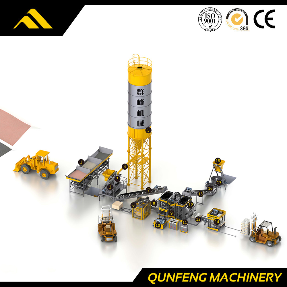 7. Băng tải đai | 8. Máy cấp pallet | 9. Máy làm khối | 10. Đơn vị thủy lực | 11. Bộ điều khiển PLC | 12. Tự động. Hệ thống cấp màu |